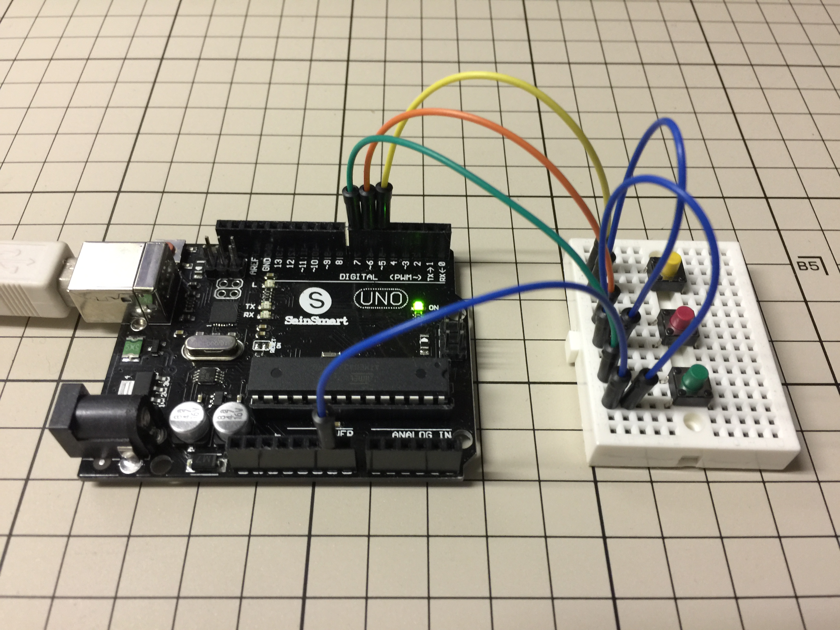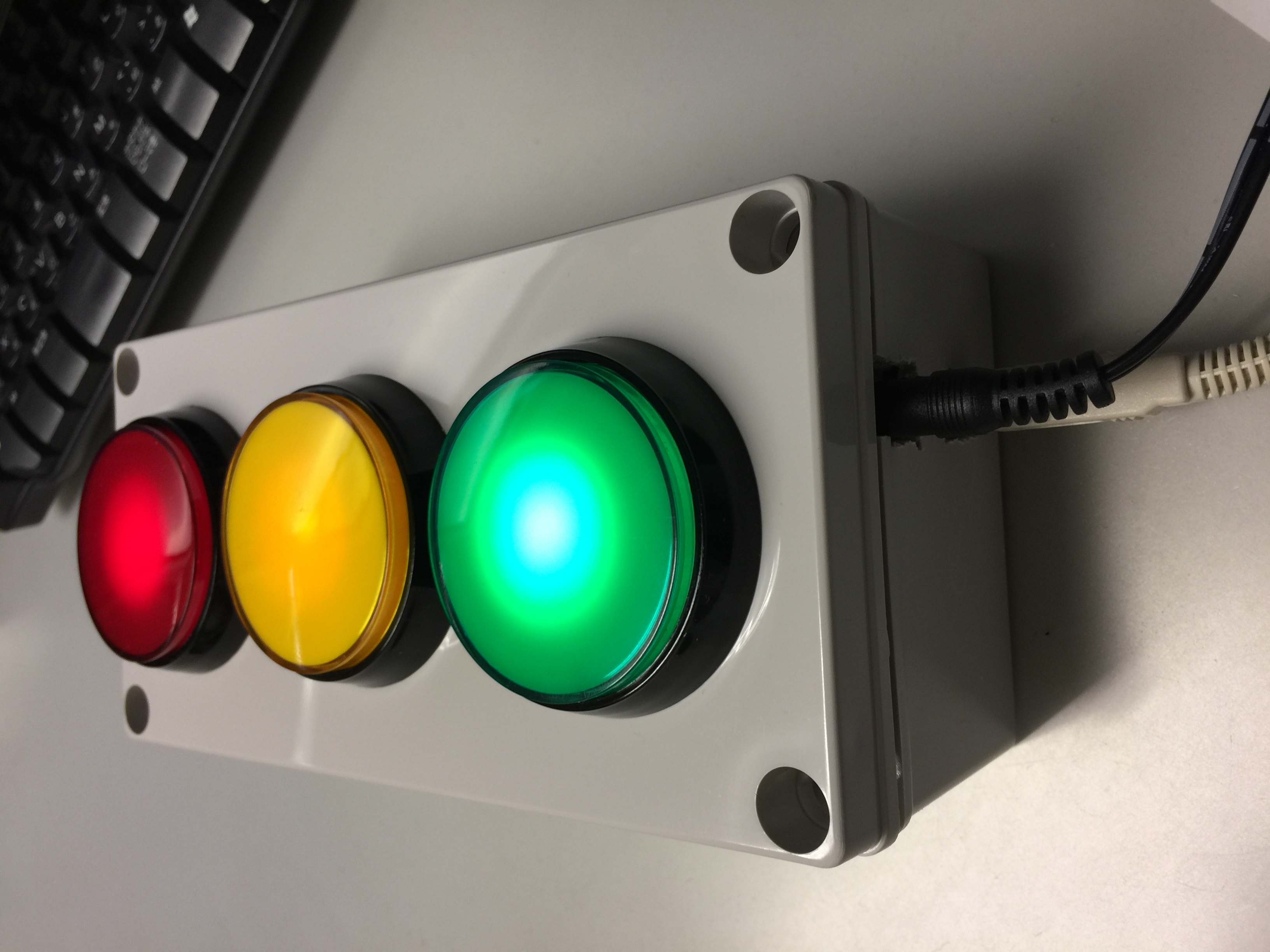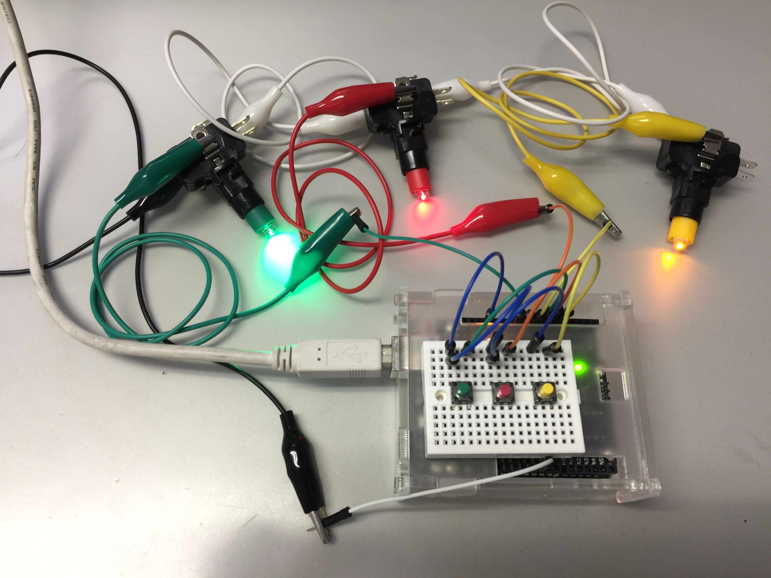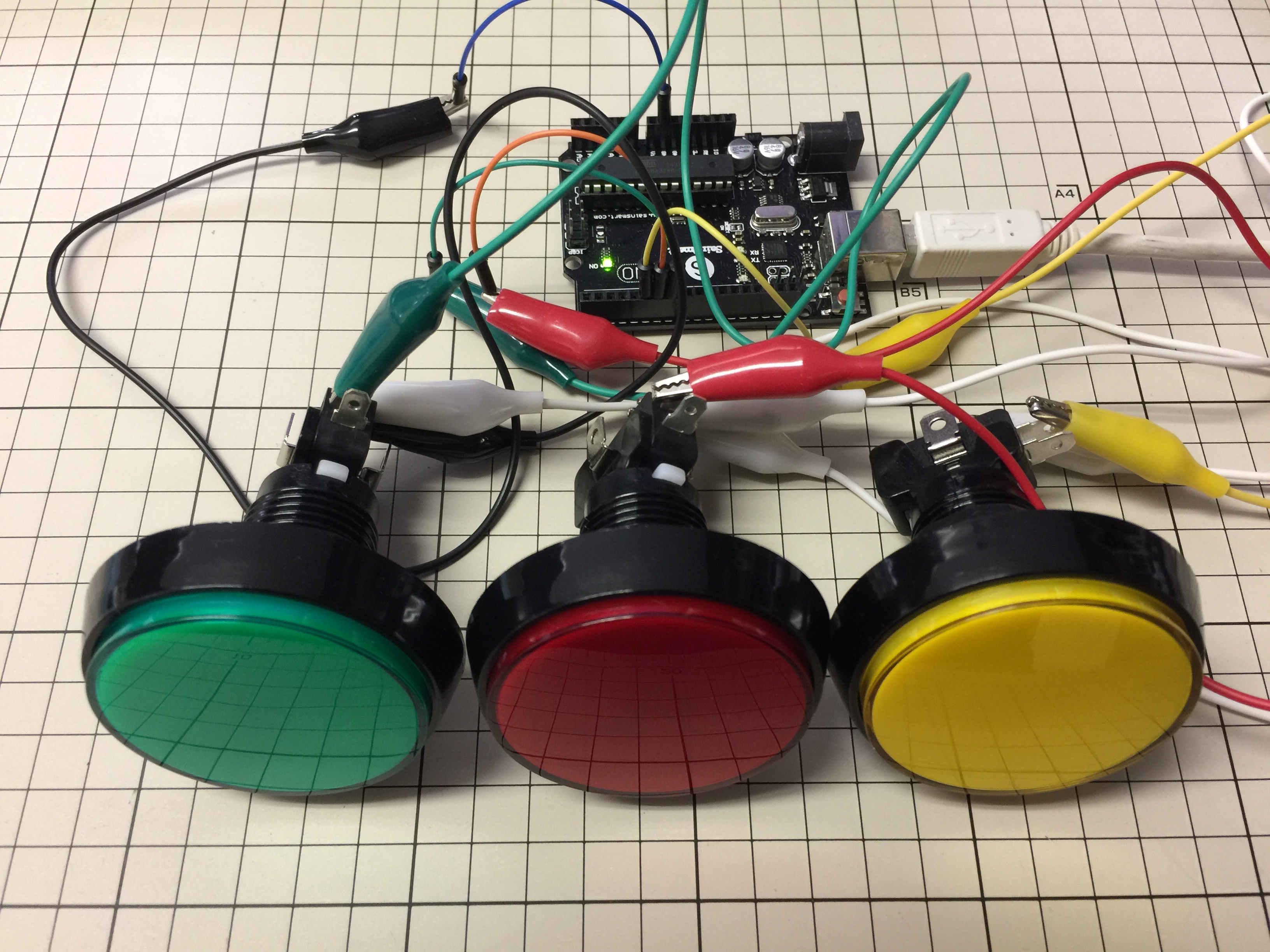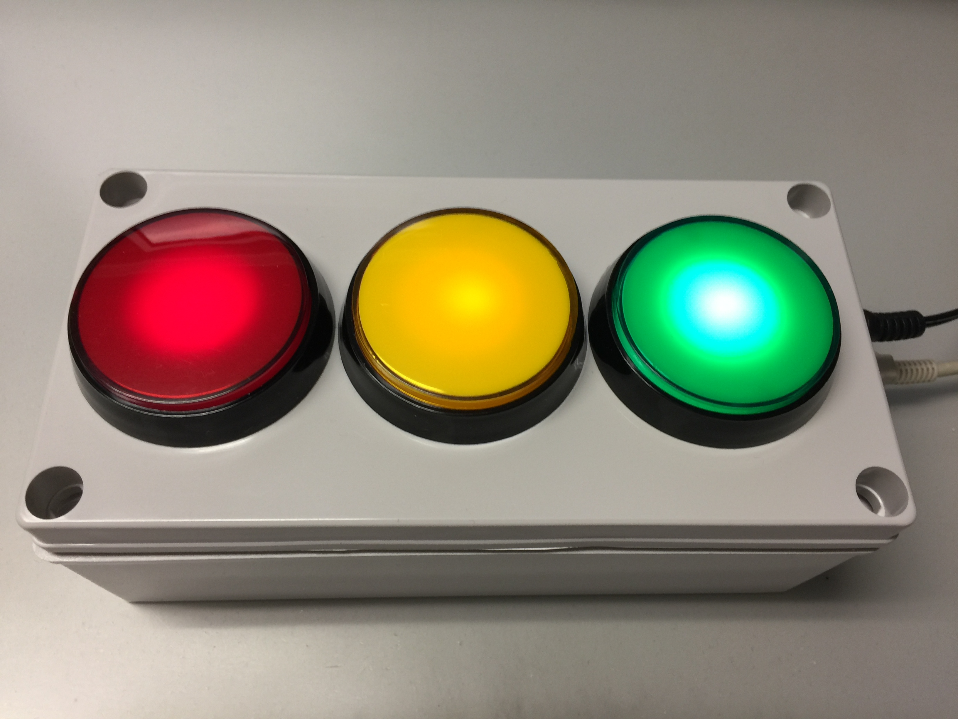 緑色と黄色のプッシュボタンは直径52mmでLEDが入っていましたが、赤色は少し違っていて直径50mmでLED無しでした。 赤色ボタンはLEDがないので、ボタンは光らせない方針とします。LEDが手に入ったら、気が変わって光らせるかもしれませんが。 (2017/08/06追記、LEDを入手しましたので、将来の事例集で光らせたいと思います。別電源にした方がいいのかな。未検討です。 LEDの印加電圧は12Vと書いてあったけど、5Vで光るんだけどなぁ) 材料表にプラボックスを書いていますが、まだプラスチックボックスへのボタンの組み込みはしていません。 ボックスに取り付け穴を開ける道具を持っていないので、近く道具を持っている人のところで加工してきます。 組み込みが終わったら、完成写真を追加したいと思います。時期は未定ですが。 写真でわかるかなぁ、Arduinoのデジタルピンの接続先を一応書いておきます。緑ボタン->7番ピン,赤ボタン->6番ピン,黄ボタン->5番ピンです。 色の順番は適当に決めたので、ご自由に~。 (*)最新のプログラムでは認識するピン番号が変わっていますので、写真の接続は参考にとどめてください。 LEDの点灯テストの様子をとりあえず掲載しておきます。 LED部分には抵抗が入っていましたので、そのままArduinoから出力しています。 緑以外は暗いですね。 プラボックスに組み込んだ完成品です。 LEDはArduinoのDC端子に入力された電圧を使えるようにしています。9V1Aまたは12V2AのDCアダプタを使っています。5Vでは緑がよく光っていましたが、9V/12Vでも傾向は同じです。緑以外の明るさはいまいちです。明るさは緑>赤>黄の順番です。写真は9VのDCアダプタを使った時のものです。 【wcs_button】 Arduinoにつないだ緑色のボタンを押すと、緑ONの状態変化がArduinoからwcs_buttonにシリアル経由で送られます。 ボタンを離すと、緑OFFの状態変化が送られます。赤色ボタンだけを押した時、黄色ボタンだけを押した時、3色すべてのボタンを押した時、のwcs_buttonの画面の様子は以下の通りです。