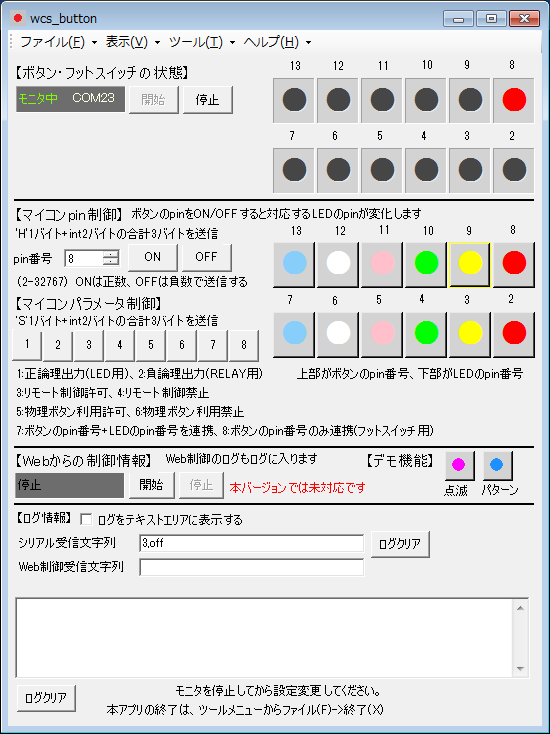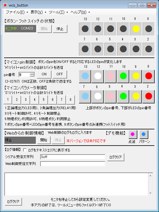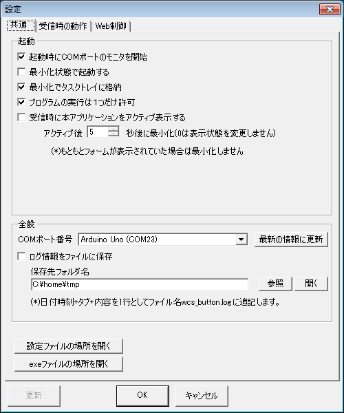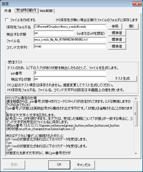 wcs_buttonの設定画面の参考です。「受信時の動作」のタブシートにある「pin番号」はArduinoから送られてくる英数記号(-+=_.)から構成される文字列で、本環境ではArduinoのデジタル接続ピン番号を想定しています。