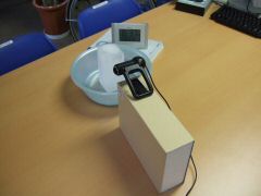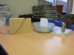 作業机の上に洗面器、氷、Webカメラ、時計を置いて撮影しました。